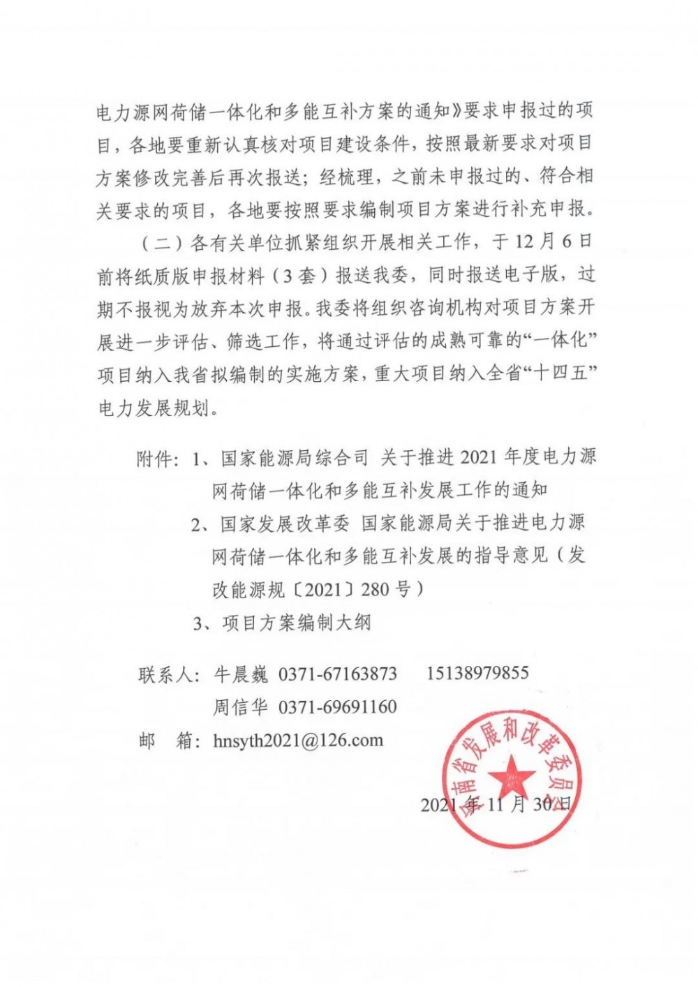 11月30日,河南省發(fā)改委發(fā)布了《關(guān)于補(bǔ)充申報(bào)“十四五”電力源網(wǎng)荷儲一體化和多能互補(bǔ)項(xiàng)目方案》的通知。按照“先行先試、逐步推廣”的原則,在今年上半年河南發(fā)改委組織申報(bào)項(xiàng)目的基礎(chǔ)上,再次補(bǔ)充申報(bào)“一體化”項(xiàng)目。