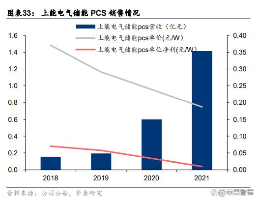 大儲是 B 端市場,廠商價格直面競爭,產品優(yōu)勢公司脫穎而出。儲能 PCS 在初期單價和毛 利率較高,隨著頭部廠商不斷擴產和新的廠商不斷進入,產業(yè)競爭加劇,價格和毛利率逐 漸走低。上能電氣 2018 年儲能 PCS 營收 0.15 億元,產品單價 0.37 元/W,2022 年儲能 PCS 營收 1.42 億元,較 2018 年增長近 9 倍,產品單價 0.19 元/W,降幅 50%,規(guī)模效應 盡顯。陽光電源光伏逆變器價格穩(wěn)中有降,由 2018 年 0.22 元/W 降至 2022 年 0.19 元/W。