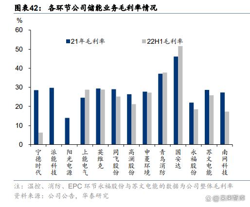 各環(huán)節(jié) 22H1 毛利率相比 21 年全年普遍走低,消防環(huán)節(jié)毛利率水平最高。21 年電芯環(huán)節(jié) 兩家企業(yè)儲能業(yè)務毛利率處于 28%-30%,22H1 受到上游鋰礦價格高漲且傳導滯后影響, 盈利空間被顯著壓縮,以寧德時代為例,22H1 毛利率下滑至 6.43%。消防環(huán)節(jié)毛利率最高, 且兩家公司 22H1 毛利率相比 21 年均有提升,我們認為主要系公司產品結構優(yōu)化致整體毛 利率水平抬升。儲能 PCS 及系統(tǒng)集成環(huán)節(jié)內各公司由于業(yè)務結構及出貨市場的不同毛利率 水平差異較大,陽光電源/上能電氣 2021 年儲能業(yè)務毛利率水平分別為 14.11% /24.52%。 溫控環(huán)節(jié)毛利率普遍在 25%-30%之間。EPC 環(huán)節(jié) 21 年毛利率普遍在 20%-30%之間,22H1 毛利率水平出現(xiàn)明顯下滑。