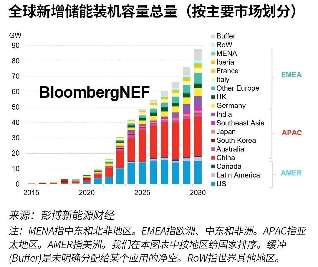 按GW計(jì),到2030年美洲地區(qū)將占到年度儲(chǔ)能裝機(jī)容量的21%。受加州、西南部和德克薩斯州的一系列大型項(xiàng)目帶動(dòng),美國是迄今為止最大的市場。由于電池成本上升,美國出現(xiàn)了一波項(xiàng)目延遲。盡管如此,美國公用事業(yè)公司繼續(xù)采購與光伏配套的儲(chǔ)能,以提高系統(tǒng)可靠性。與此同時(shí),一些長時(shí)儲(chǔ)能項(xiàng)目獲得發(fā)展動(dòng)力。智利市場改革可能為拉丁美洲新興儲(chǔ)能市場新增裝機(jī)容量加速鋪平道路。智利和巴西各地光伏和風(fēng)電裝機(jī)容量迅速增長,墨西哥電網(wǎng)投資不足,這可能為儲(chǔ)能提供機(jī)會(huì)。