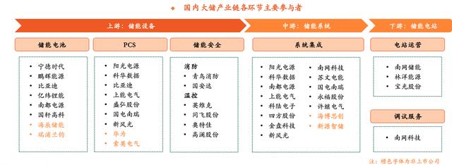 大儲(chǔ)產(chǎn)業(yè)鏈主要包括上游儲(chǔ)能設(shè)備、中游系統(tǒng)集成、下游電站等環(huán)節(jié)。儲(chǔ)能電池和PCS是大儲(chǔ)產(chǎn)業(yè)鏈價(jià)值量最大的兩個(gè)環(huán)節(jié),陳驍?shù)热苏J(rèn)為,儲(chǔ)能電池絕對(duì)龍頭寧德時(shí)代,第二梯隊(duì)比亞迪、鵬輝能源、億緯鋰能、國(guó)軒高科、南都電源、海辰儲(chǔ)能等有望借國(guó)內(nèi)大儲(chǔ)市場(chǎng)加速贏得動(dòng)力電池之外的第二成長(zhǎng)曲線。國(guó)內(nèi)大儲(chǔ)PCS頭部企業(yè)陽光電源、科華數(shù)據(jù)、上能電氣、盛弘股份、國(guó)電南瑞、新風(fēng)光等在裝機(jī)提速+毛利改善下業(yè)績(jī)有望受益。
