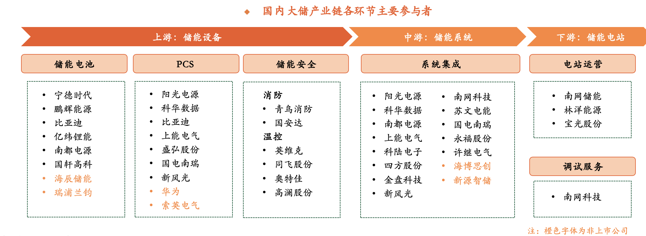 大儲(chǔ)產(chǎn)業(yè)鏈主要包括上游儲(chǔ)能設(shè)備、中游系統(tǒng)集成、下游電站等環(huán)節(jié)。儲(chǔ)能電池和PCS是大儲(chǔ)產(chǎn)業(yè)鏈價(jià)值量最大的兩個(gè)環(huán)節(jié),陳驍?shù)热苏J(rèn)為,儲(chǔ)能電池絕對(duì)龍頭寧德時(shí)代,第二梯隊(duì)比亞迪、鵬輝能源、億緯鋰能、國軒高科、南都電源、海辰儲(chǔ)能等有望借國內(nèi)大儲(chǔ)市場加速贏得動(dòng)力電池之外的第二成長曲線。國內(nèi)大儲(chǔ)PCS頭部企業(yè)陽光電源、科華數(shù)據(jù)、上能電氣、盛弘股份、國電南瑞、新風(fēng)光等在裝機(jī)提速+毛利改善下業(yè)績有望受益。