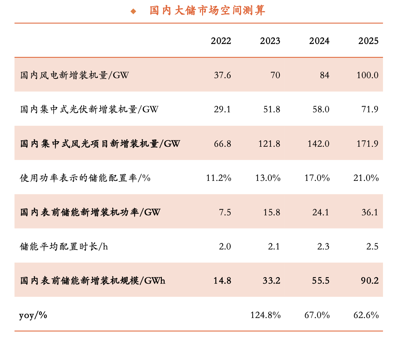 根據(jù)平安證券測算,假設(shè)2023/2024/2025年儲(chǔ)能配置率分別為13%/17%/21%,時(shí)長分別為2.1h/2.3h/2.5h。今年國內(nèi)大儲(chǔ)新增裝機(jī)有望達(dá)到33.2GWh,同比增長124.8%;到2025年,國內(nèi)大儲(chǔ)新增裝機(jī)量有望進(jìn)一步增長至90.2GWh,2022-2025年復(fù)合增長率達(dá)83%。