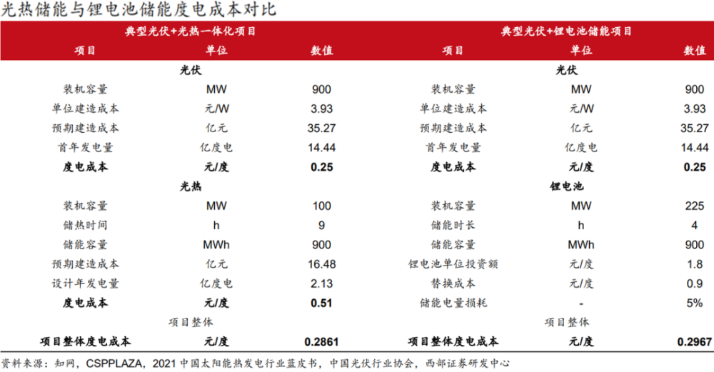 在現(xiàn)行項(xiàng)目配置下,西部證券對比了“光伏+光熱”和“光伏+鋰電池”兩種項(xiàng)目的經(jīng)濟(jì)性,兩者項(xiàng)目整體的度電成本分別為 0.2861/0.2967 元 /度,光熱的儲能經(jīng)濟(jì)性更高,有利于“十四五”期間裝機(jī)加速發(fā)展。