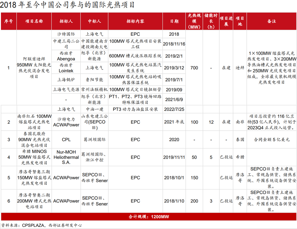 中國公司光熱技術(shù)已經(jīng)較為成熟,有豐富的出海經(jīng)驗(yàn),據(jù)不完全統(tǒng)計(jì), 2018 年至今中國公司作為 EPC 方參與的國際光熱項(xiàng)目規(guī)模合計(jì)達(dá)到 1200MW,占比達(dá)到 1/6。