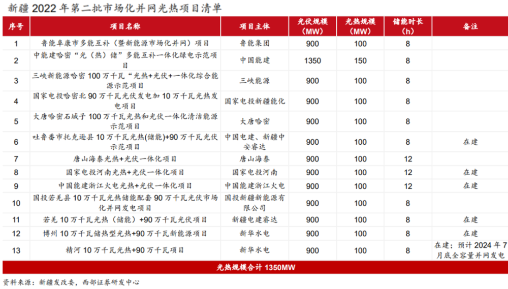 一方面,新疆、青海陸續(xù)發(fā)布第二批新能源項(xiàng)目清單,其中光熱項(xiàng)目規(guī)模分別達(dá)到1350MW、400MW,占比均達(dá)到 20%以上。同時(shí),新疆發(fā)改委提出鼓勵(lì)光伏與儲熱型光熱發(fā)電以 9∶1 規(guī)模配建。