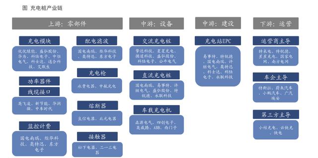 再來拆下充電樁的產(chǎn)業(yè)鏈,充電樁的產(chǎn)業(yè)鏈很簡單,上游是零部件、中游是設(shè)備加工制造,再到下游運營環(huán)節(jié)。