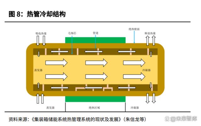 相變材料和熱管冷卻仍處于在研階段,成本和穩(wěn)定性是影響其投產(chǎn)的重要原 因。相變材料冷卻是使電池單體直接接觸相變材料,利用其相變過程吸收熱 量實(shí)現(xiàn)對鋰離子電池的冷卻。相變材料冷卻可以明顯提升儲能系統(tǒng)溫度分布 的均勻性,但其價格較高,且當(dāng)相變材料吸熱時,其體積變化明顯,容易對 儲能系統(tǒng)的工作性能產(chǎn)生影響。熱管是一種利用介質(zhì)在吸熱端的蒸發(fā)帶走熱 量,再在放熱端通過冷凝的方式將熱量傳遞到外界的裝置,這一冷卻技術(shù)已 相對成熟,但其成本較高,在手機(jī)等電子設(shè)備上使用較多,應(yīng)用于儲能系統(tǒng) 上性價比低。