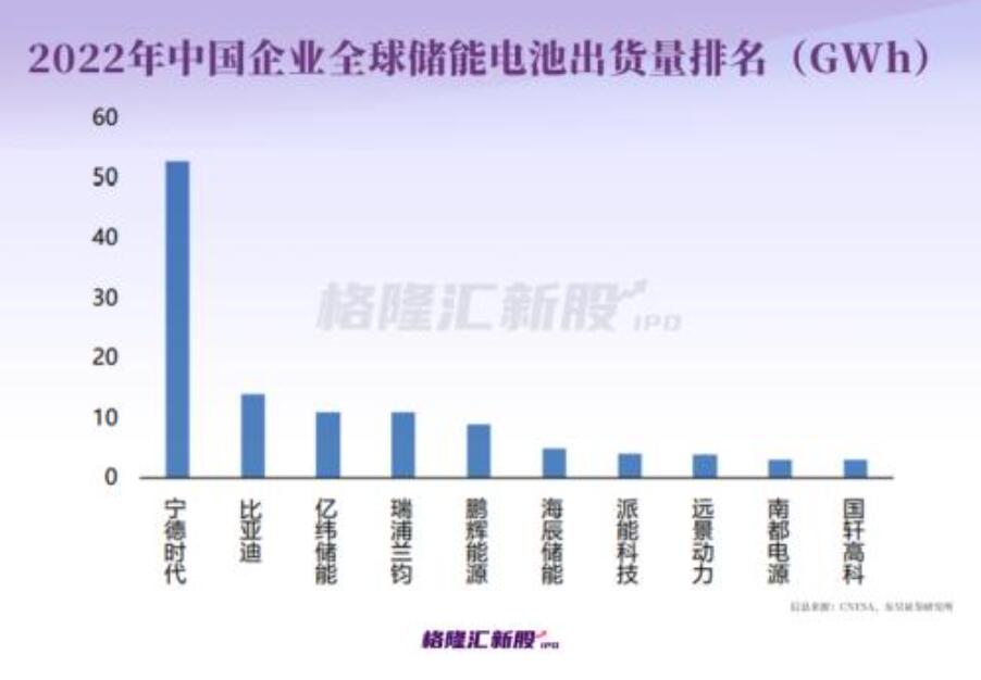 行業(yè)競爭方面,根據(jù)SNE Research的數(shù)據(jù),2022年全球儲(chǔ)能電池出貨量排名中,寧德時(shí)代、比亞迪、億緯鋰能分別以53GWh、14GWh和9.5GWh位列前三。
