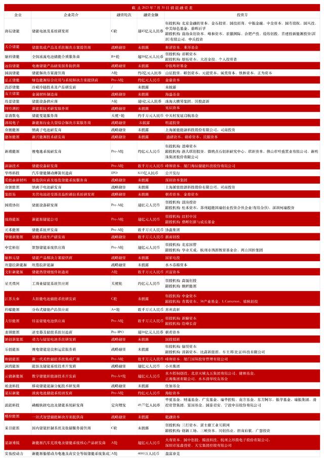 7月5日,海辰儲能完成45億元C輪融資;4月17日,融科儲能完成超10億元B+輪融資;3月20日,星源博瑞A輪融資數(shù)億源、大鋅能源完成pre-A輪融資數(shù)千萬元、華錦新能源完成天使輪融資數(shù)千萬元;3月28日,精控能源完成C輪數(shù)億元融資;3月18日,緯景儲能完成超6億元A輪融資等等。其中儲能戰(zhàn)略融資事件最多達(dá)23起,其次是A輪融資共18起。