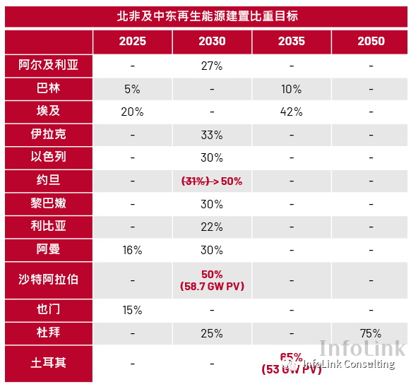 由于既有較成熟市場的商業(yè)模式與供應(yīng)鏈成型,進入門坎拉高也更為競爭,因此新興市場如東南亞、中東、南美、非洲等成為企業(yè)欲搶占布局之區(qū),且受到光伏市場的刺激會帶動儲能維持熱度與需求,應(yīng)用面今年則以表后工商業(yè)更受關(guān)注。然而,大部分此些市場的政策、程序、供應(yīng)鏈、再生能源規(guī)模、電網(wǎng)、建設(shè)環(huán)境等都遠不如較成熟市場,相對也就需要更長的爬坡期且影響發(fā)展速率變量更多,導(dǎo)致該市場可能大幅起落。例如,新興市場目前出臺的政策多是以整體再生能源建置為目標(biāo),對于儲能的需求或發(fā)展尚無明確指引,以下表整理的北非與中東為例;其次,中國六月份的儲能裝機規(guī)模中工商業(yè)占比僅1%,說明市場需求與情緒雖旺盛,但實際規(guī)模需更審慎評估。