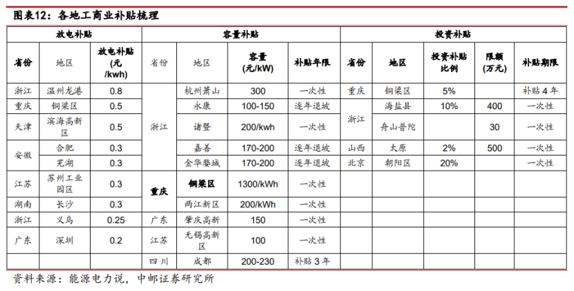 另外,2022年以來,工商業(yè)儲能直接補貼政策頻發(fā),鼓勵分布式光伏配儲,補貼方式包括容量補貼、放電補貼和投資補貼等。
