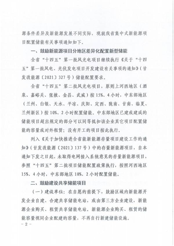 8月15日,甘肅發(fā)改委發(fā)布《關(guān)于甘肅省集中式新能源項目儲能配置有關(guān)事項的通知》。文件提出,鼓勵新能源項目分地區(qū)差異化配置新型儲能: