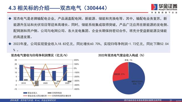 雙杰電氣是老牌輸配電企業(yè),產(chǎn)品涵蓋配電網(wǎng)、新能源、儲(chǔ)能和充換電等。其中,輸配電業(yè)務(wù)復(fù)蘇,新能源升壓站和光伏項(xiàng)目等迎來高增長。同時(shí),儲(chǔ)能系統(tǒng)集成取得突破,產(chǎn)品廣泛應(yīng)用在新能源的發(fā)電側(cè)、配網(wǎng)測和用戶側(cè)。公司與電網(wǎng)公司、各大發(fā)電集團(tuán)、企業(yè)長期保持密切合作,將充分受益新能源及儲(chǔ)能的高速發(fā)展。2022年度,公司實(shí)現(xiàn)營業(yè)收入18.82億元,同比增長60.70%,實(shí)現(xiàn)歸母凈利潤-1.72億元,同比下降52.04% 。