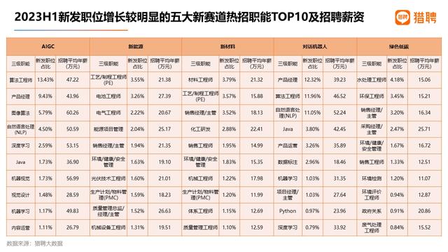 獵聘大數(shù)據(jù)研究院發(fā)布的《2023上半年就業(yè)趨勢大數(shù)據(jù)洞察》顯示,AIGC(人工智能生成內(nèi)容)、新能源、新材料、對話機器人、綠色低碳五個賽道的新發(fā)職位今年上半年同比增長相對明顯,其中新能源位列第二位,數(shù)量同比增長42.49%。