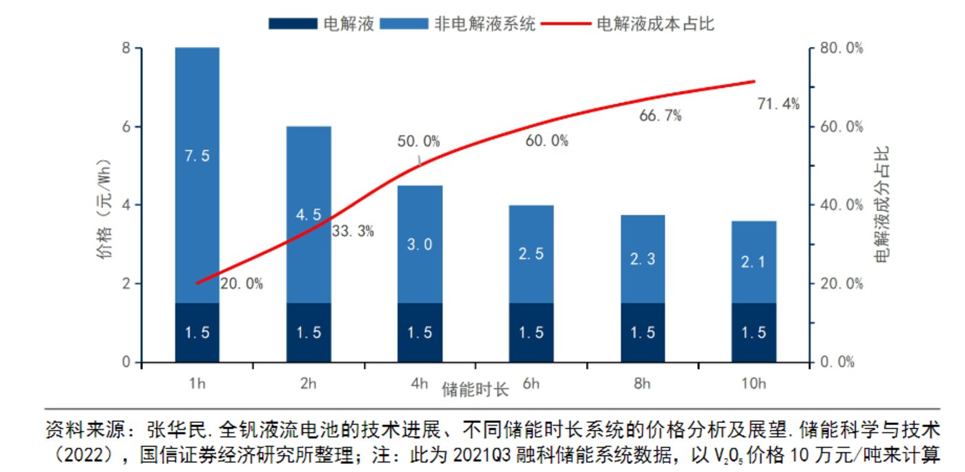 從經(jīng)濟(jì)性上看,全釩液流電池儲能的初始投資成本在2.5元-7.5元/Wh,時長越大,單瓦時的投建成本越低,8小時以上可以降到2元/Wh左右,接近鋰電儲能。而且,全釩液流電池的壽命長達(dá)20年,是鋰電池的2倍,這進(jìn)一步攤低了初始投資的單位成本,成本更優(yōu)于鋰電儲能系統(tǒng)。即便是20年壽命到期,釩液流電池電解液的殘值和循環(huán)利用價值也高達(dá)30%以上,全生命周期成本更低。未來,隨著更多全釩液流電池儲能項目的上馬,很容易在市場層面引發(fā)共鳴。