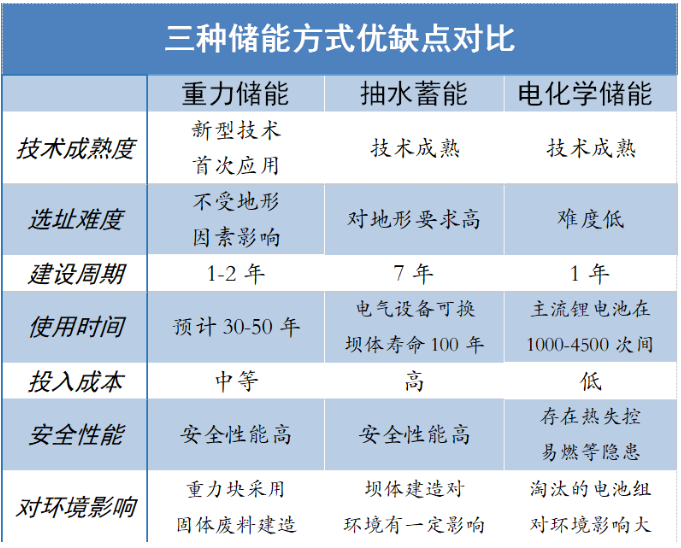 目前大家常聽到的儲能方式有「抽水蓄能」「化學(xué)儲能」,三者各有各的特點(diǎn),咱們一先看一張表。