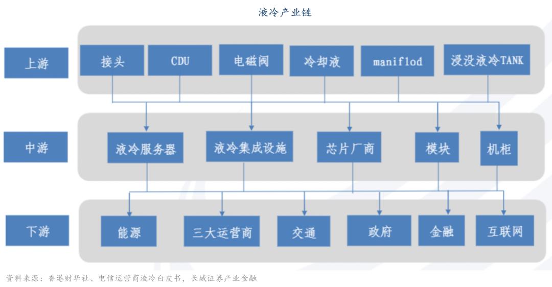 相比于風(fēng)冷技術(shù),液冷具有更高的冷卻效率和成長性。根據(jù)中國證券報研究,產(chǎn)品零部件提供商、液冷服務(wù)器提供商及算力使用者貫穿整個液冷產(chǎn)業(yè)生態(tài)的上、中、下游。我國液冷技術(shù)起步稍晚于國外,但起步后發(fā)展迅速,后期與國外發(fā)展進程基本同步,并且在液冷規(guī)模試點應(yīng)用方面積累了豐富經(jīng)驗。