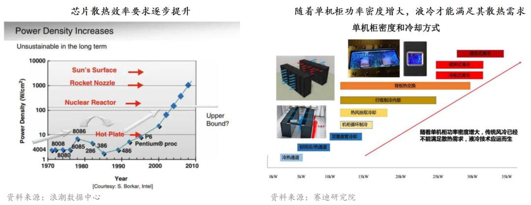 AI等新的應(yīng)用場景出現(xiàn),對算力設(shè)備和承載算力的數(shù)據(jù)中心均提出更高的要求。在拉動數(shù)據(jù)中心的需求的同時,伴隨著算力密度的提高,算力設(shè)備、數(shù)據(jù)中心機柜的熱密度都將顯著提高,液冷技術(shù)在數(shù)據(jù)中心散熱和算力設(shè)備散熱的全鏈條導(dǎo)入將加快。