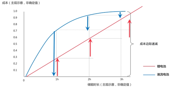 相較動(dòng)輒發(fā)生安全事故的鋰電池,液流電池不燃燒、不爆炸,本征安全優(yōu)勢(shì)突出。其儲(chǔ)能時(shí)長(zhǎng)大于8小時(shí),使用壽命超過(guò)20年,循環(huán)次數(shù)超過(guò)15000次等優(yōu)勢(shì),更適合未來(lái)大量使用新能源的電網(wǎng),也被視為最適合長(zhǎng)時(shí)儲(chǔ)能的電池技術(shù)之一。并且,隨著儲(chǔ)能時(shí)長(zhǎng)的增加,液流電池的投資成本邊際遞減。