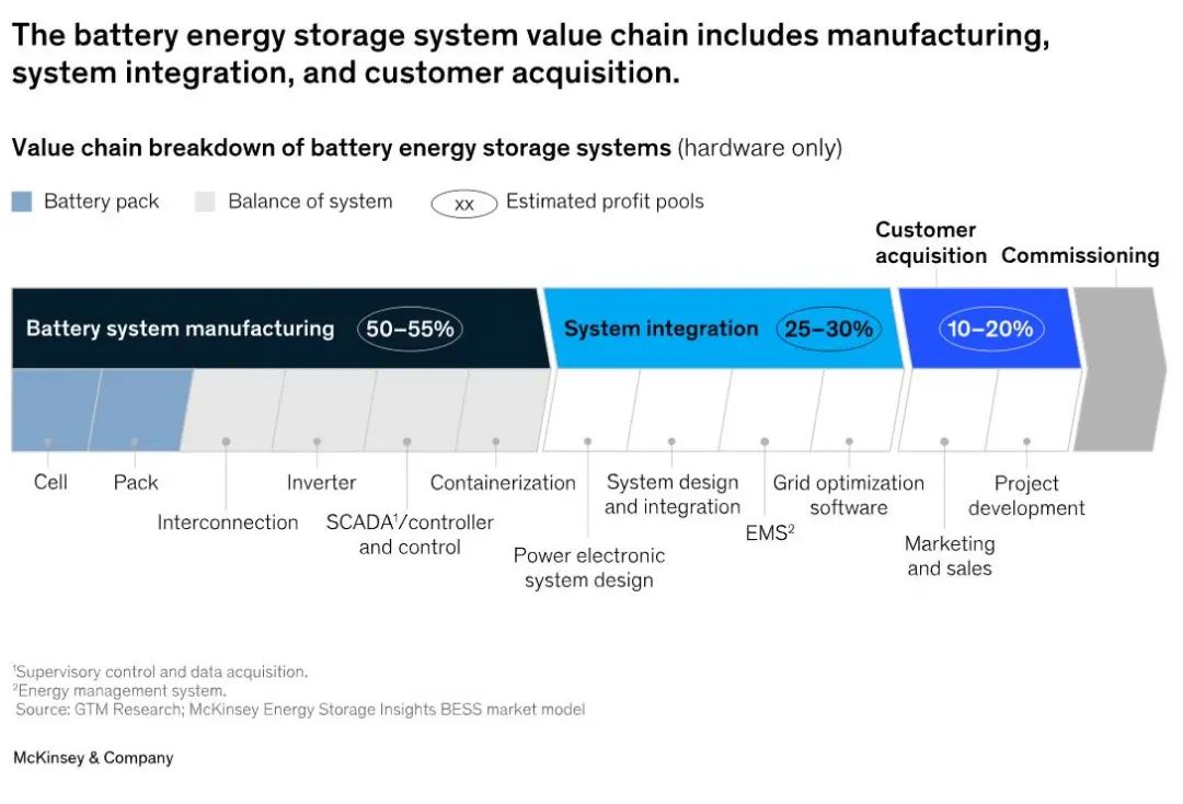 然后是系統(tǒng)集成活動,包括能源管理系統(tǒng)和其他軟件的總體設計和開發(fā),以使電化學儲能更加靈活和有用。預計這些集成商將獲得另外25%至30%的利潤。最后,10%到20%的利潤池與銷售實體、項目開發(fā)組織、其他客戶獲取活動和調試相關。