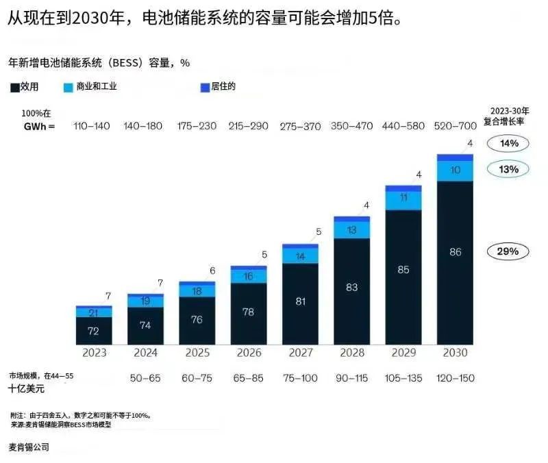 我們預計,公用事業(yè)規(guī)模的電化學儲能(已占新增年產能的大部分)將在未來六年中每年都增長29%左右,是三個細分市場中增長最快的。預計到2030年,公用事業(yè)規(guī)模的年度裝機容量將達到450至620吉瓦時(GWh),公用事業(yè)規(guī)模的電化學儲能將占據當年總市場的90%。