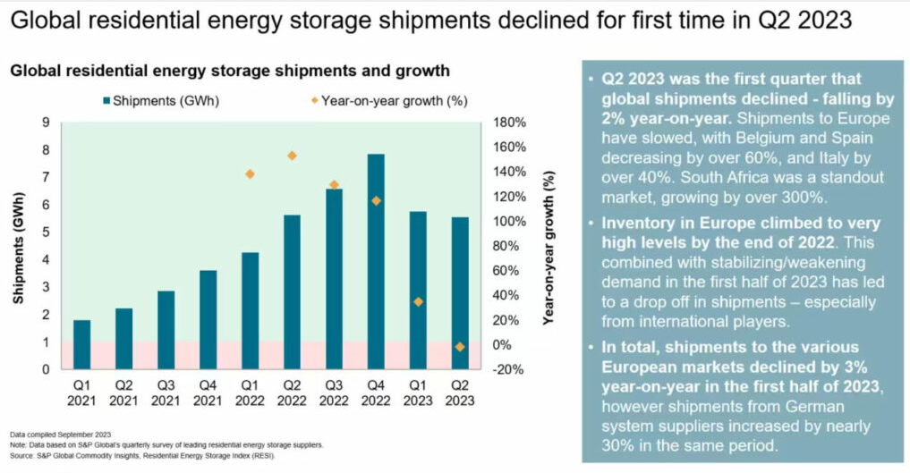 標(biāo)準(zhǔn)普爾全球(S&P Global)公司在日前發(fā)布的一份研究報(bào)告指出,在能源價(jià)格波動(dòng)較小、庫(kù)存高企以及成本上升的背景下,全球戶(hù)用儲(chǔ)能系統(tǒng)出貨量在2023年第二季度首次同比下降。