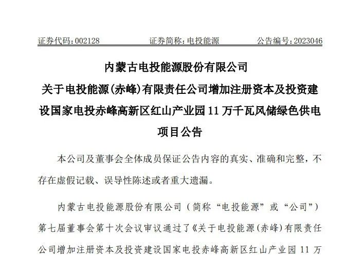 電投能源:計(jì)劃在赤峰建設(shè)16.25MW/65MWh磷酸鐵鋰+0.25MW/1MWh全釩液流電池混合儲(chǔ)能系統(tǒng)項(xiàng)目電投能源(002128.SZ)發(fā)布公告,公司擬對(duì)電投能源(赤峰)有限責(zé)任公司增加注冊(cè)資本,并投資建設(shè)國(guó)家電投赤峰高新區(qū)紅山產(chǎn)業(yè)園11萬(wàn)千瓦風(fēng)儲(chǔ)綠色供電項(xiàng)目。擬將該公司注冊(cè)資本由450萬(wàn)元增加至1.56億元。