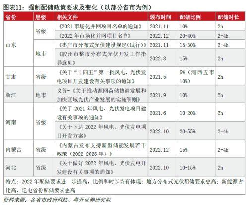 強(qiáng)制配儲(chǔ)政策客觀上拉動(dòng)儲(chǔ)能裝機(jī)需求。2021年2月,國(guó)家發(fā)改委、能源局出臺(tái)《關(guān)于推進(jìn)電力源網(wǎng)荷儲(chǔ)一體化和多能互補(bǔ)發(fā)展的指導(dǎo)意見》,明確增量風(fēng)光儲(chǔ)一體化要優(yōu)化配套儲(chǔ)能規(guī)模,充分發(fā)揮儲(chǔ)能調(diào)峰、調(diào)頻作用。5月出臺(tái)的《關(guān)于2021年風(fēng)電、光伏發(fā)電開發(fā)建設(shè)有關(guān)事項(xiàng)的通知》也指出保障性并網(wǎng)以外的項(xiàng)目,需通過自建、合建共享或購(gòu)買服務(wù)等市場(chǎng)化方式落實(shí)并網(wǎng)條件后并網(wǎng)。自此,多地相繼發(fā)布電源側(cè)風(fēng)光強(qiáng)制配儲(chǔ)政策,多要求10%/2h的配置比例和時(shí)長(zhǎng),并且政策要求逐漸向15-30%和4-5h的高比例、長(zhǎng)時(shí)儲(chǔ)能發(fā)展。事實(shí)上,多地風(fēng)光項(xiàng)目招標(biāo)競(jìng)爭(zhēng)過程中,實(shí)際配儲(chǔ)情況高于政策要求。