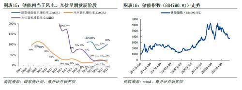 通過裝機(jī)增長(zhǎng)率看儲(chǔ)能行業(yè)所處發(fā)展位置,當(dāng)前儲(chǔ)能裝機(jī)兩年復(fù)合增長(zhǎng)率在00%上下,相當(dāng)于風(fēng)電、光伏行業(yè)發(fā)展早期。我們對(duì)儲(chǔ)能行業(yè)發(fā)展大勢(shì)的研判如下: