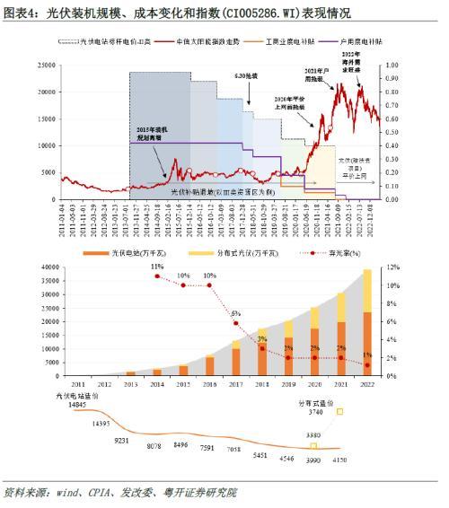 3、具體來看:1)風(fēng)電呈現(xiàn)周期性行情:三上漲與兩回調(diào)交錯(cuò),對(duì)應(yīng)行業(yè)擴(kuò)張與嚴(yán)監(jiān)管交替。風(fēng)電周期性行情與行業(yè)供需均衡情況相匹配,行業(yè)快速擴(kuò)張或增速放緩背后的原因在于政策引導(dǎo)或限制需求,復(fù)盤風(fēng)電發(fā)展和指數(shù)表現(xiàn),我們發(fā)現(xiàn)風(fēng)電行情周期大約在5年左右,每2-3年進(jìn)行一次峰谷切換。2)光伏“四上一下”行情:規(guī)劃、補(bǔ)貼和需求是驅(qū)動(dòng)因素。單復(fù)盤光伏指數(shù)走勢(shì),光伏1-2年出現(xiàn)一波行情,但結(jié)合行業(yè)監(jiān)管和企業(yè)出清來看,光伏產(chǎn)業(yè)發(fā)展和行情周期仍為5年左右,期間受補(bǔ)貼退坡等事件驅(qū)動(dòng),指數(shù)出現(xiàn)階段性行情。