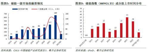 從儲(chǔ)能公司投融資角度來看,近兩年儲(chǔ)能一級(jí)和二級(jí)市場(chǎng)投融資熱度高漲。不完全統(tǒng)計(jì)數(shù)據(jù)顯示,截至2023年一季度,300余家儲(chǔ)能企業(yè)獲得融資,涉及投融資事件900余件、已披露融資金額近2000億元。其中,2021年儲(chǔ)能披露融資金額近600億元,2022年儲(chǔ)能行業(yè)全年融資189次。二級(jí)市場(chǎng)方面,近三年儲(chǔ)能相關(guān)公司IPO多達(dá)97家,占儲(chǔ)能指數(shù)(885921.TI)比重達(dá)24.8%,此外也有部分上市公司于近些年實(shí)現(xiàn)儲(chǔ)能業(yè)務(wù)的突破和轉(zhuǎn)型。