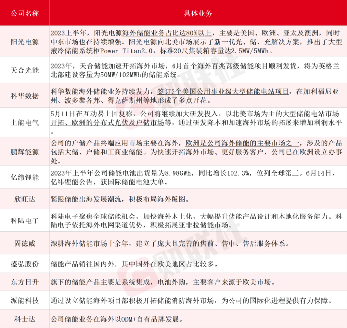 業(yè)內(nèi)人士表示,隨著2023年美國(guó)光伏裝機(jī)重新恢復(fù)增長(zhǎng)及ITC補(bǔ)貼力度的加大,預(yù)計(jì)美國(guó)儲(chǔ)能需求將恢復(fù)翻倍以上的增速。對(duì)此,不少儲(chǔ)能企業(yè)紛紛加速“出海”,以全面進(jìn)軍海外市場(chǎng)為主要目標(biāo)。據(jù)財(cái)聯(lián)社不完全整理,在海外有布局儲(chǔ)能相關(guān)業(yè)務(wù)的上市公司主要為陽(yáng)光電源、天合光能、科華數(shù)據(jù)、上能電氣、鵬輝能源、億緯鋰能、欣旺達(dá)、科陸電子、固德威、盛弘股份、東方日升、派能科技、科士達(dá)等,具體情況如下: