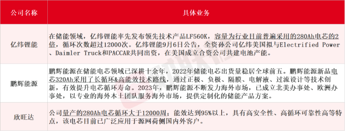 據(jù)財(cái)聯(lián)社不完全整理,出口海外的儲(chǔ)能電芯A股上市公司主要為億緯鋰能、鵬輝能源、欣旺達(dá)等,還包括自研電芯配套戶儲(chǔ)終端產(chǎn)品的企業(yè),如比亞迪、派能科技等。而另一邊,儲(chǔ)能電池出海的風(fēng)吹向了大儲(chǔ),截至目前,已經(jīng)有包括瑞浦蘭鈞、遠(yuǎn)景動(dòng)力、海辰儲(chǔ)能、億緯鋰能等多家企業(yè)獲海外儲(chǔ)能集成商大單,單筆最大訂單已達(dá)10GWh。A股上市公司具體業(yè)務(wù)如下: