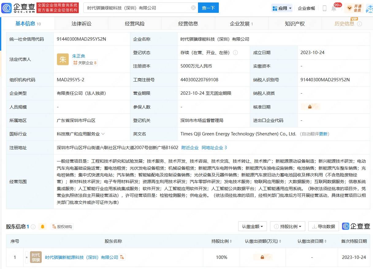 近日,時(shí)代騏驥綠能科技(深圳)有限公司成立,法定代表人為朱正良,注冊(cè)資本5000萬(wàn)元人民幣,經(jīng)營(yíng)范圍包含:新能源原動(dòng)設(shè)備制造、電動(dòng)汽車(chē)充電基礎(chǔ)設(shè)施運(yùn)營(yíng)、光伏發(fā)電設(shè)備租賃、人工智能行業(yè)應(yīng)用系統(tǒng)集成服務(wù)等。