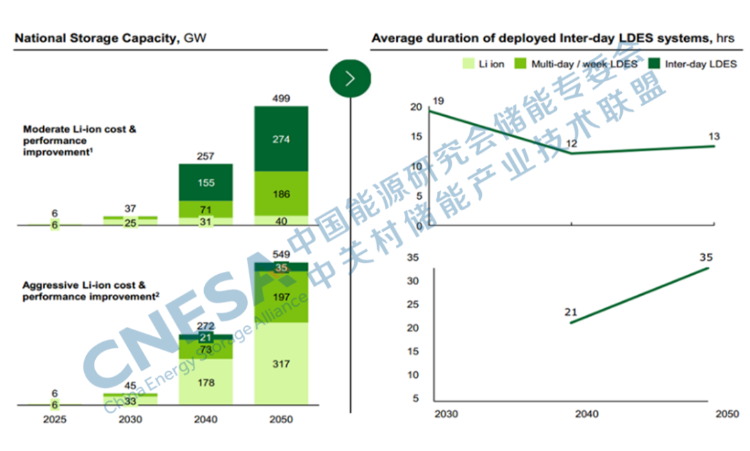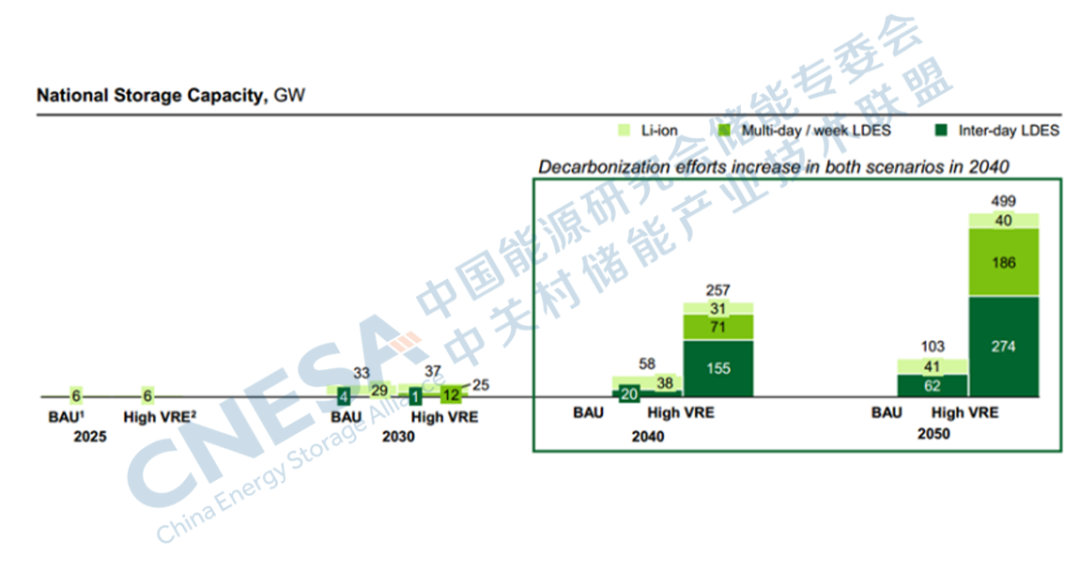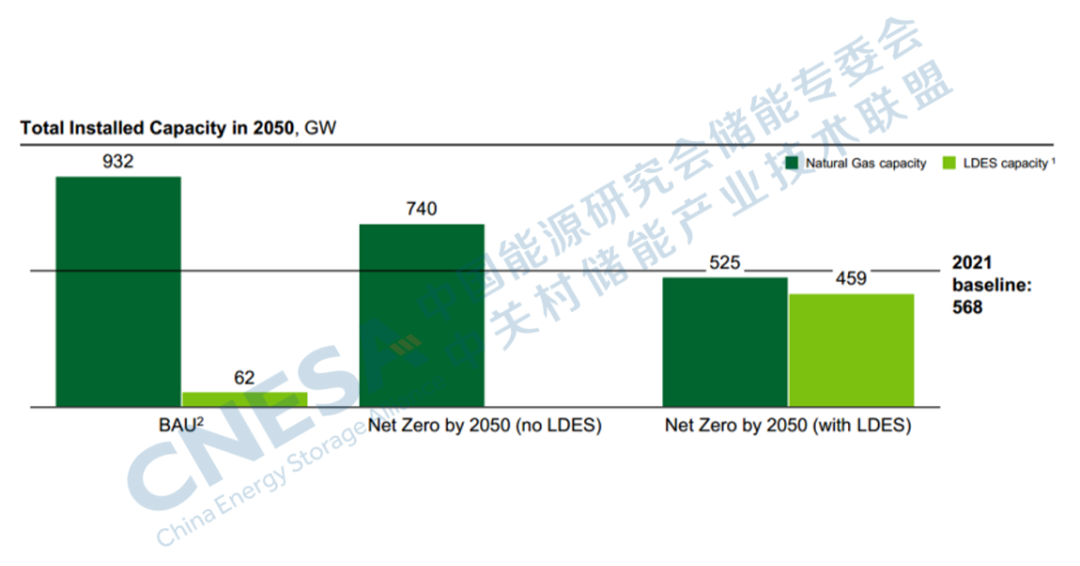 圖2:2050年實(shí)現(xiàn)BAU和Net Zero脫碳目標(biāo)下的LDES預(yù)測(cè)