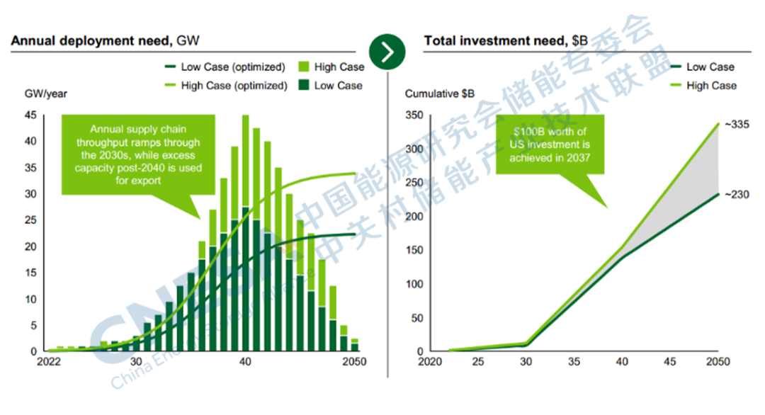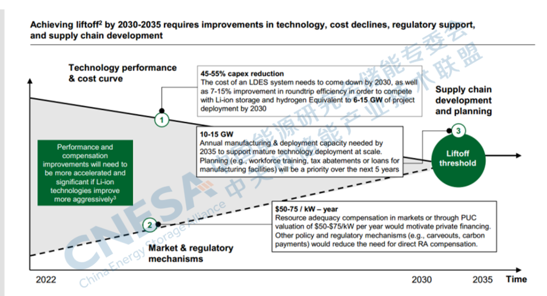 備注:圖中PUC代表公共事業(yè)委員會(huì),RA代表資源充足。起飛點(diǎn)被定義為L(zhǎng)DES行業(yè)成為一個(gè)很大程度上自我維持的市場(chǎng);在鋰離子電池競(jìng)爭(zhēng)的情況下,仍然需要多日/周的LDES技術(shù),而積極的鋰離子電池將減少供應(yīng)鏈建設(shè)的需求。