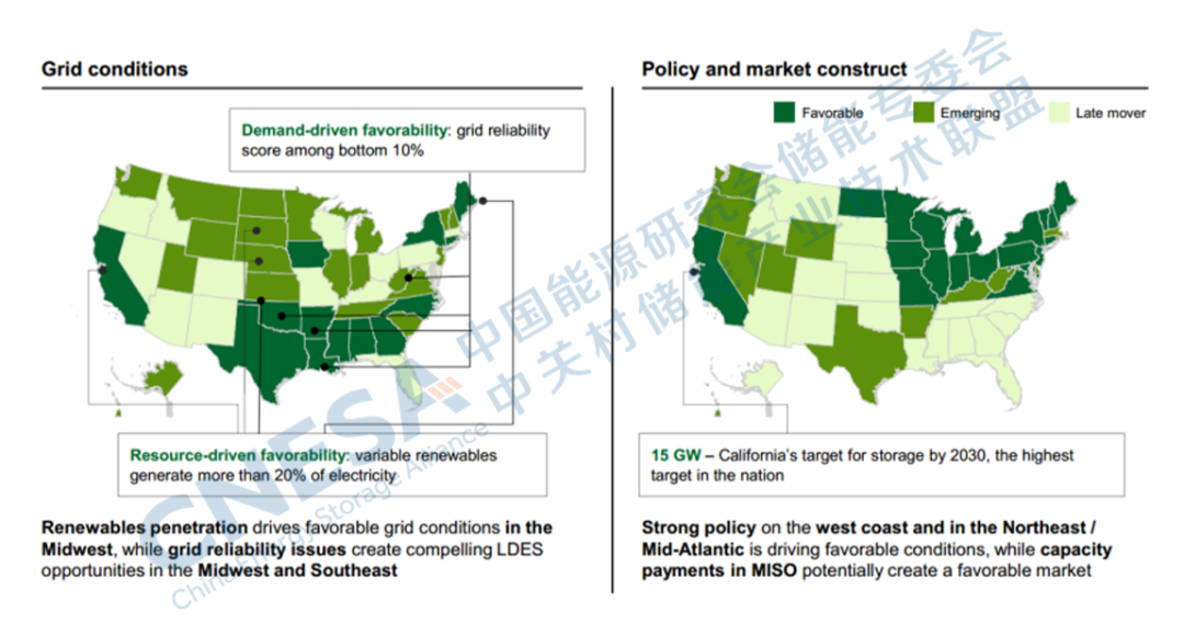 在美國(guó)由于不同的電網(wǎng)條件、政策和市場(chǎng)結(jié)構(gòu),LDES部署的就緒程度各不相同。報(bào)告指出:有兩個(gè)因素可以用來(lái)評(píng)估市場(chǎng)LDES的就緒程度:電網(wǎng)條件、政策和市場(chǎng)結(jié)構(gòu)。一是電網(wǎng)條件。衡量LDES在特定狀態(tài)下的可獲得性和相對(duì)可行性,以及整體發(fā)電組合。影響因素包括間歇性可再生能源的滲透率百分比、輸配電投資缺口、SAIDI/SAIFI得分衡量的電網(wǎng)彈性以及互聯(lián)的難易程度。二是政策和市場(chǎng)結(jié)構(gòu)。衡量地方政策和收入結(jié)構(gòu)對(duì)在該州部署具有有利風(fēng)險(xiǎn)調(diào)整回報(bào)預(yù)期的LDES的有利程度。影響因素包括可再生能源投資組合標(biāo)準(zhǔn)(RPSs)、是否有容量支付以及支付的水平等。通過(guò)評(píng)估,可以得出加利福尼亞、德克薩斯、紐約、緬因州、愛荷華州和康涅狄格州在近期內(nèi)具有很高的潛力(圖8)。