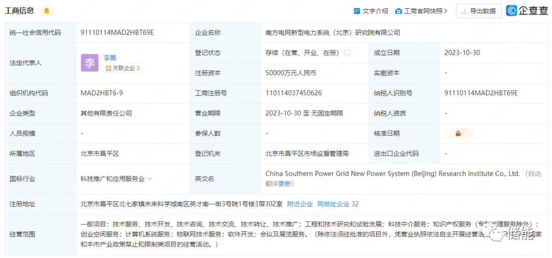 10月30日,南方電網新型電力系統(tǒng)(北京)研究院有限公司注冊成立,法定代表人為李鵬,注冊資本5億元人民幣,該公司由中國南方電網有限責任公司及旗下南方電網數字電網集團有限公司、南方電網科學研究院有限責任公司共同持股。