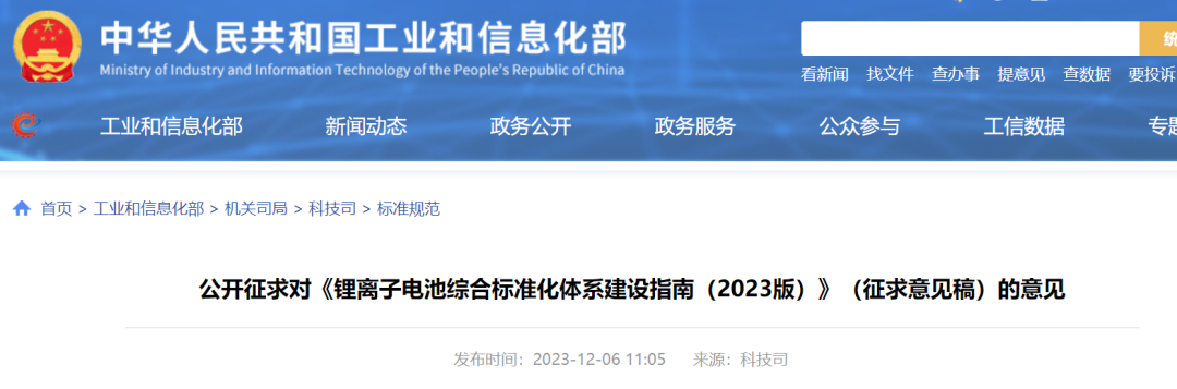 工信部公開征求對《鋰離子電池綜合標準化體系建設(shè)指南(2023版)》(征求意見稿)的意見