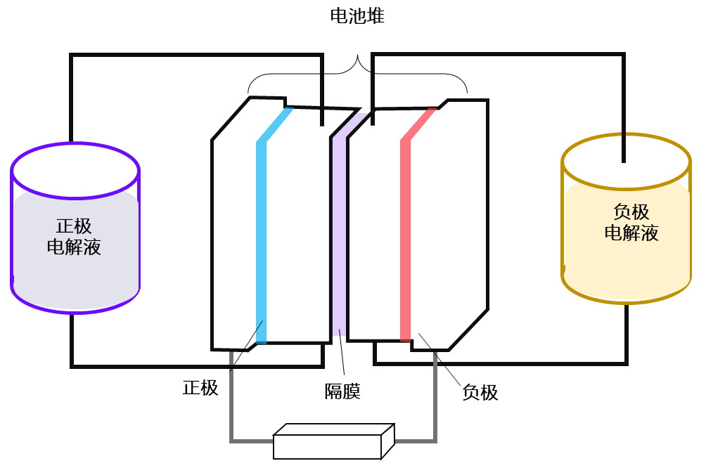其次,從運(yùn)行原理上來看,液流電池的電解液,儲存在電池堆外的罐中。充放電時(shí),正負(fù)極電解質(zhì)會分別從循環(huán)泵進(jìn)入電池堆,發(fā)生氧化反應(yīng),反應(yīng)完成后,電解液會被重新泵回罐體中,照此循環(huán)往復(fù),直到反應(yīng)完全。由于電化學(xué)反應(yīng)和整個(gè)充放電過程,都是在水性的條件下發(fā)生,沒有燃燒爆炸的風(fēng)險(xiǎn),可確保絕對安全。