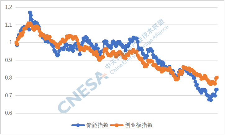 圖2: 2021-2023年儲能指數(shù)與創(chuàng)業(yè)版指數(shù)的對比