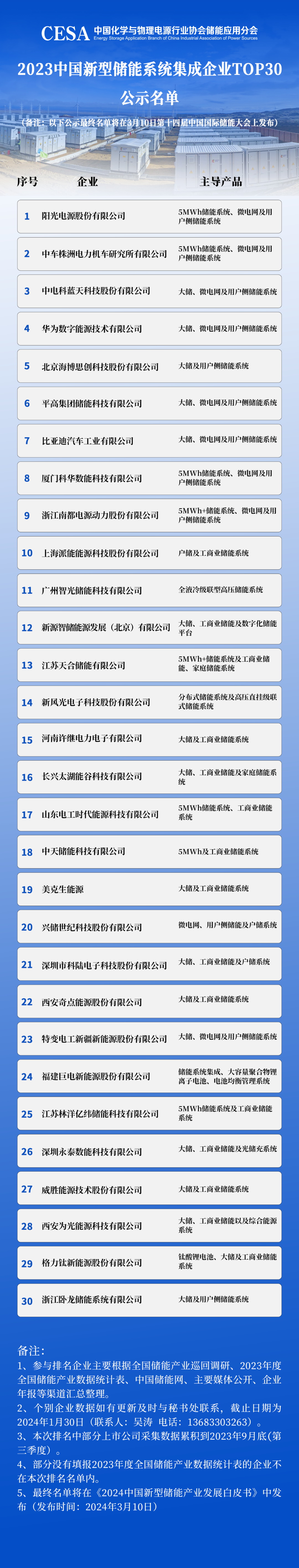本次儲(chǔ)能產(chǎn)業(yè)鏈百強(qiáng)企業(yè)評選活動(dòng)針對的對象主要是 CESA 儲(chǔ)能應(yīng)用分會(huì)廣大會(huì)員企業(yè)和與儲(chǔ)能業(yè)務(wù)緊密相關(guān)的上市公司,評價(jià)數(shù)據(jù)以2023年為準(zhǔn),主要通過協(xié)會(huì)實(shí)地走訪調(diào)研、會(huì)員企業(yè)年度數(shù)據(jù)申報(bào)、媒體披露和上市公司年報(bào)等多個(gè)渠道,最終形成2023中國新型儲(chǔ)能鋰離子電池企業(yè)TOP20、2023中國新型儲(chǔ)能系統(tǒng)集成企業(yè)TOP30、2023中國新型儲(chǔ)能PCS企業(yè)TOP30、2023中國新型儲(chǔ)能液流電池企業(yè)TOP30、2023中國工商業(yè)儲(chǔ)能企業(yè)TOP60、2023中國新型儲(chǔ)能BMS企業(yè)TOP10、2023中國新型儲(chǔ)能飛輪儲(chǔ)能企業(yè)TOP10、2023中國新型儲(chǔ)能溫控系統(tǒng)企業(yè)TOP20、2023中國新型儲(chǔ)能消防與安全企業(yè)TOP 20、2023中國新型儲(chǔ)能壓縮空氣儲(chǔ)能企業(yè)TOP10及2023中國新型儲(chǔ)能產(chǎn)業(yè)企業(yè)TOP100名單。