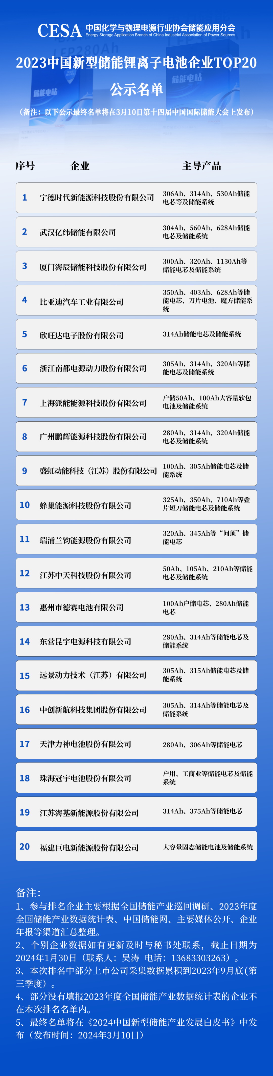 本次儲能產(chǎn)業(yè)鏈百強企業(yè)評選活動針對的對象主要是 CESA 儲能應(yīng)用分會廣大會員企業(yè)和與儲能業(yè)務(wù)緊密相關(guān)的上市公司,評價數(shù)據(jù)以2023年為準(zhǔn),主要通過協(xié)會實地走訪調(diào)研、會員企業(yè)年度數(shù)據(jù)申報、媒體披露和上市公司年報等多個渠道,最終形成2023中國新型儲能鋰離子電池企業(yè)TOP20、2023中國新型儲能系統(tǒng)集成企業(yè)TOP30、2023中國新型儲能PCS企業(yè)TOP30、2023中國新型儲能液流電池企業(yè)TOP30、2023中國工商業(yè)儲能企業(yè)TOP60、2023中國新型儲能BMS企業(yè)TOP10、2023中國新型儲能飛輪儲能企業(yè)TOP10、2023中國新型儲能溫控系統(tǒng)企業(yè)TOP20、2023中國新型儲能消防與安全企業(yè)TOP 20、2023中國新型儲能壓縮空氣儲能企業(yè)TOP10及2023中國新型儲能產(chǎn)業(yè)企業(yè)TOP100名單。