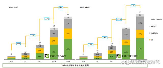 展望2024年,TrendForce集邦咨詢預計,24年全球儲能新增裝機有望達71GW/167GWh,同比增長36%/43%,保持高增。
