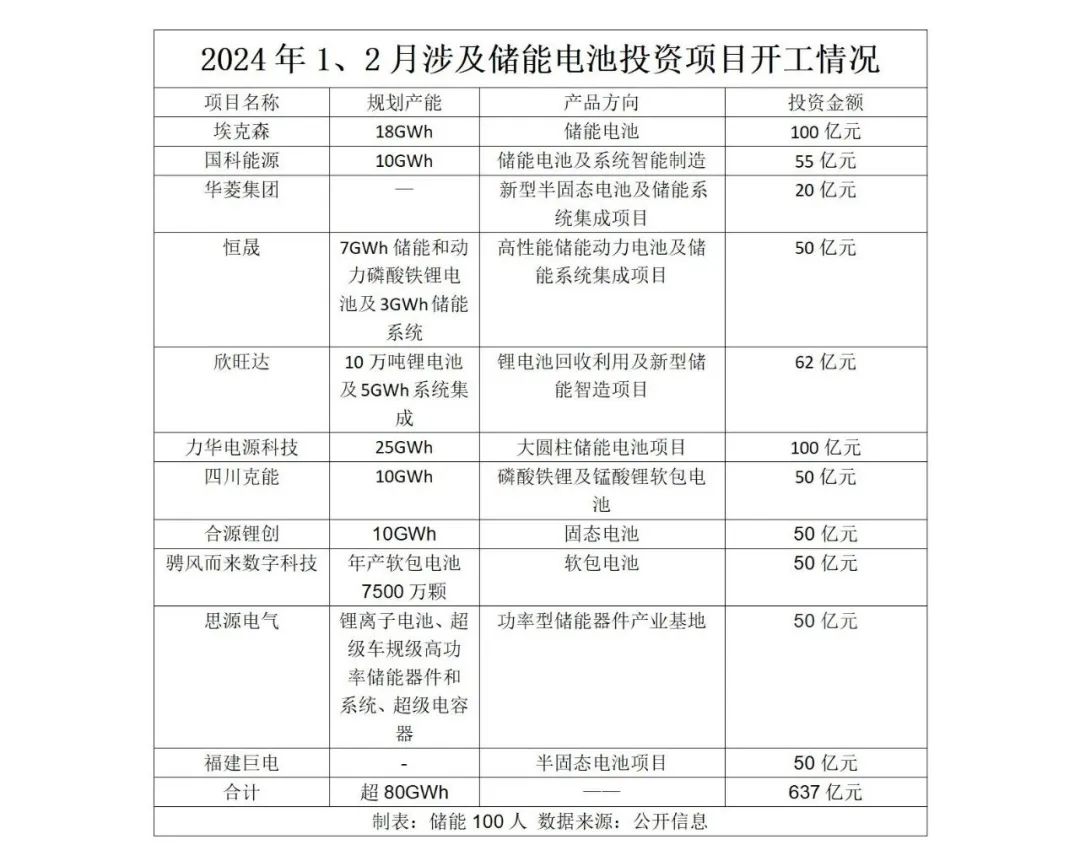 2024年剛開局,儲能電池擴產不停歇。據統(tǒng)計,1、2月涉及儲能電池的開工項目已超過10個,總產能超80GWh,總投資超600億元。