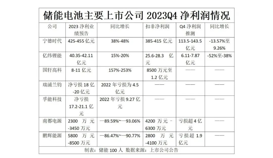 從鋰電儲能電池上市公司公布的業(yè)績預告來看,2023年四季度凈利潤普遍增速放緩或下滑。寧德時代雖然日賺過億,但第四季度的凈利潤有可能出現同比下滑的情況。