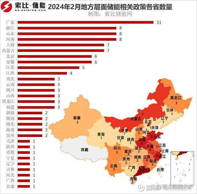 從地域出發(fā),2月地方層面出臺的儲能相關(guān)政策分布在30個省市地區(qū),其中廣東憑借11條儲能相關(guān)政策領(lǐng)跑全國。