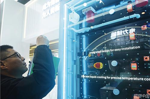 2024年3月11日,杭州,觀眾在中國國際儲能大會參觀億緯鋰能的液冷儲能設(shè)施。