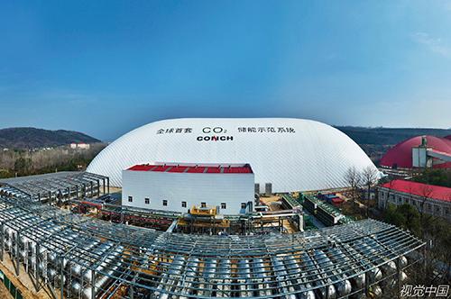 2024年1月9日,安徽省蕪湖市,繁昌區(qū)繁陽鎮(zhèn)庫山村,航拍正在并網(wǎng)發(fā)電的海螺集團(tuán)10MW/80MWh二氧化碳儲能示范系統(tǒng)項目。